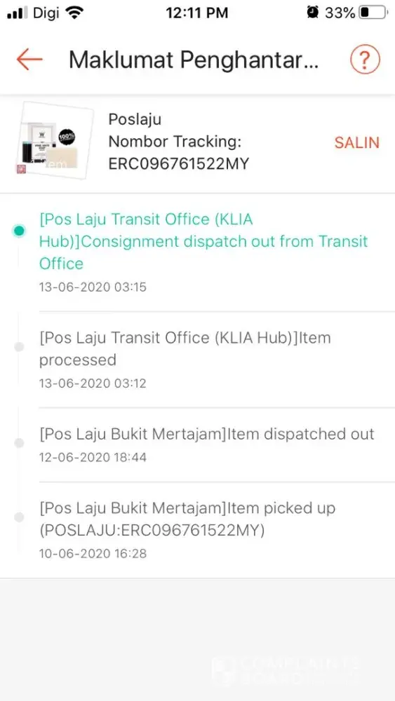 saya order barang pada 10/06/20 dan item already picked up pada tarikh yg sama. Masalahnya tracking tak update start 13/06/2020 sampai lah hari ni (07/07/2020) masih tersekat dia KLIA Hub. Hampir sebulan barang saya kena kuarantin di HUB tu. Seller pun blum dpt payment lagi. Boleh ka pihak poslaju tlg usahakan cari brg saya ni, risau kalau tercicir sebab brg yang saya order kemudian telah sampai. brg satu ni saja yg tak update-update.