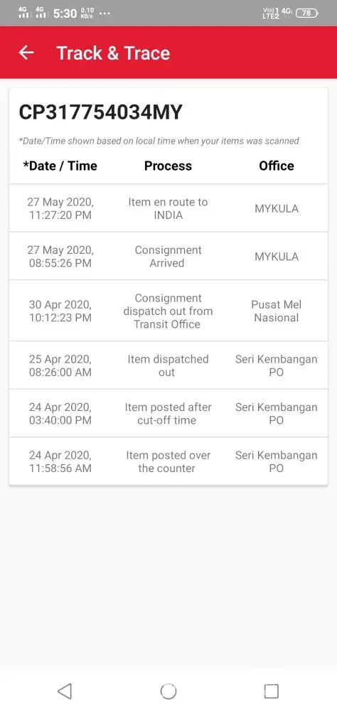 CP317754034MY not received my place from malaysia 24/may/2020. Waiting so long no response. please send it to my address at the earliest.