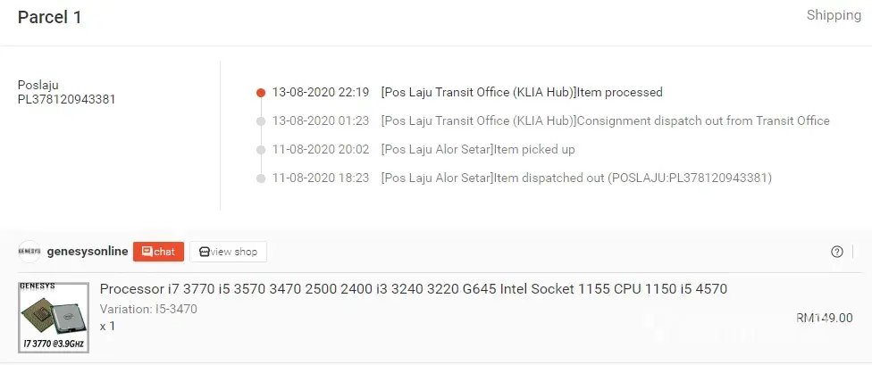 13/08/20: [Pos Laju Transit Office (KLIA Hub)]Item processed.