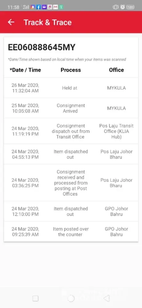 I'd buy an iphone casing since Sunday (29/03/20) and the items has deliver to Poslaju Batu Caves. I checked my tracking number ERB526585042MY and still ‘on process'. STILL ON PROCESS until now, Friday (03/04/20). Why it takes almost a week to process the parchel? I also call customer service contact but unfortunately, the number doesn't exist, like heck? Ur officer should determind and update your system & communication. Please have a check immediately on my track id because its been a week tho. Thanks