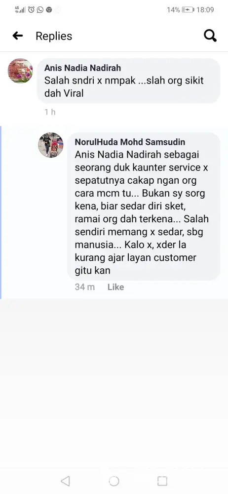 Seperti merujuk perkara diatas, sy ingin membuat aduan berkaitan 2 orang staff Di kaunter cawangan seperti diatas atas kelakuan yg kurang ajar serta me layan customer dengan cara acuh x acuh serta suka memperli customer Jika customer bertanya & tidak tau sesuatu perkara.