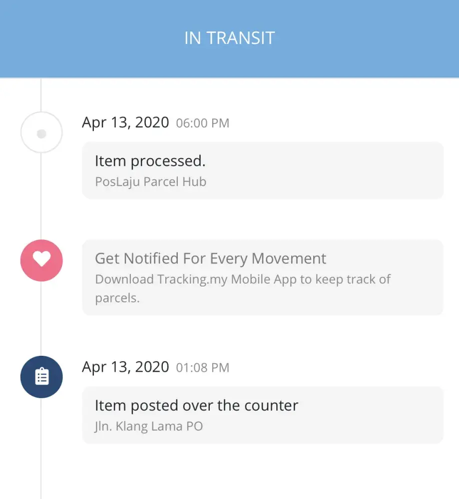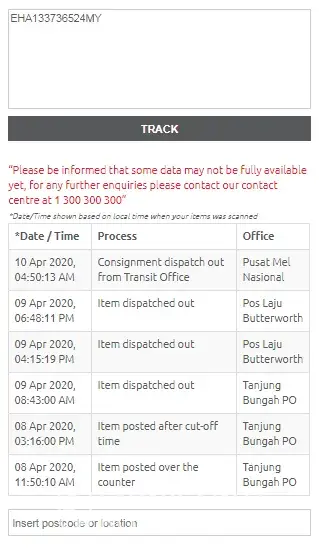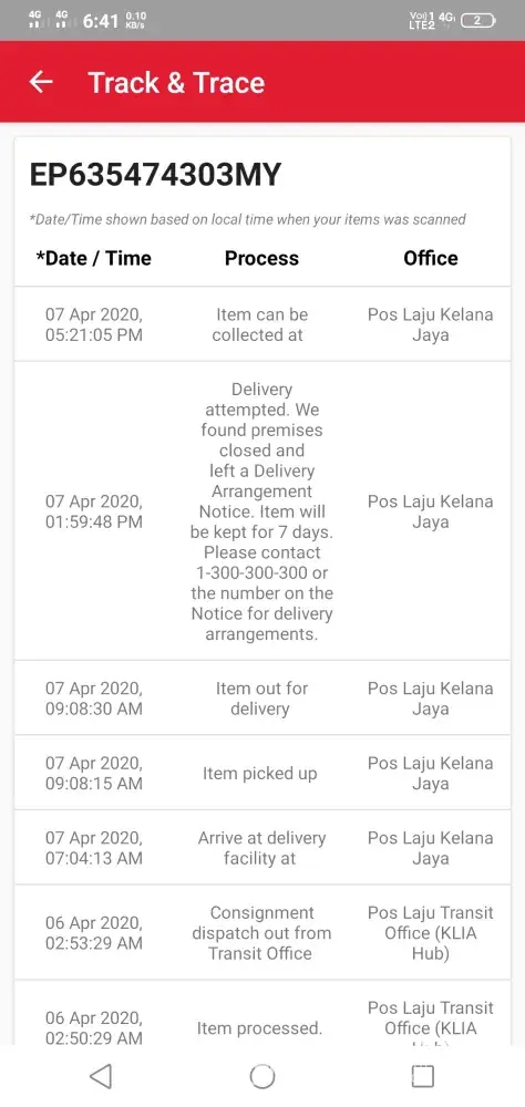 Seterusnya, item telah "posted over" ke kaunter pada 6.4.2020. Kemaskini terakhir ialah pada 7.4.2020 menyatakan bahawa item sedang diproses. Dan sehingga hari ini tiada sebarang update dari pihak poslaju.
