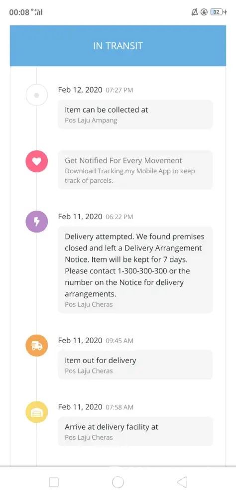 (I'm using friend address) item out of for delivery at 12.03.2020, 10.28 am.. I'm ask my friend about item if she received, She said not yet. I'm call pos laju office at 5.40 pm and ask if the postman returned to their office.. He said not yet. He gave me the postman number. I'm call the postman at 5.45 pm and ask if he hve delivered the item, he said he give to person at infront home. I'm telling him why you give to wrong address.. He says no one at home means the right address.. I'm trying to track down the item. He decided to give item named Hajijah. Hajijah home's is next to. My friend's daughter go to that home and ask if she received item from postman. She said not sure. My friend's daughter came back and returned with empty-handed.