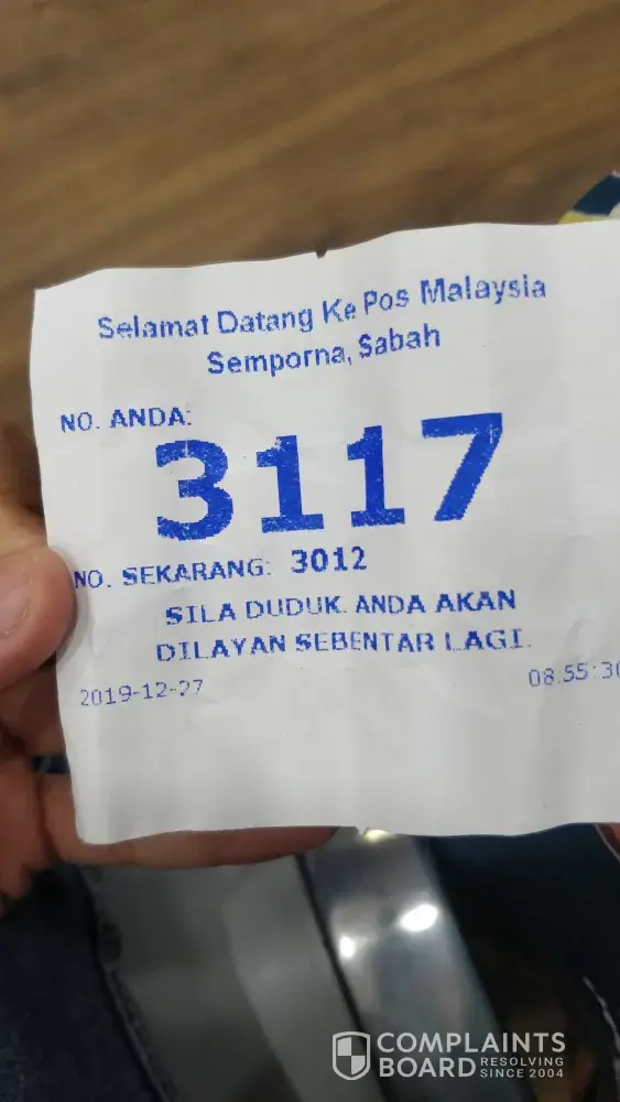 Merujuk perkara di atas, pada 27hb Disember 2019, di antara 8.50am-11am, dan nombor yang terkini baru sahaja yang ke-3039. Walhal saya telah datang awal dan mendapat nombor giliran yang ke-3117. Melihat kepada kesesakan pelanggan, aliran servis juga menjadi lambat dan purata masa 15minit untuk setiap nombor. Hanya empat orang staff pos malaysia berada di kaunter. Seharusnya Pos Malaysia peka dengan kepadatan penduduk di sini dan perlu meningkatkan lagi jumlah staff untuk menanggung kapasiti pelanggan yang datang setiap hari. Sekian terima kasih