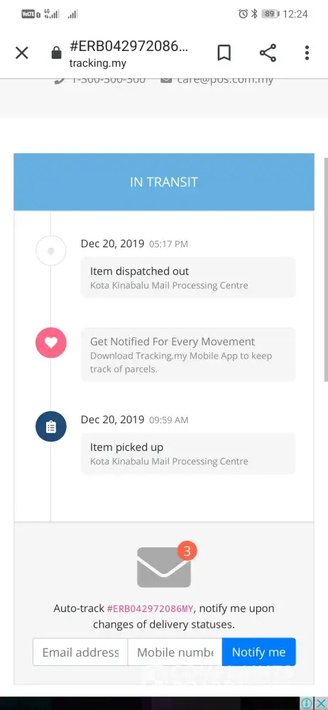Tracking no. EH 90 642 723 3MY (Pos Laju cawangan Shah Alam / Subang Jaya)