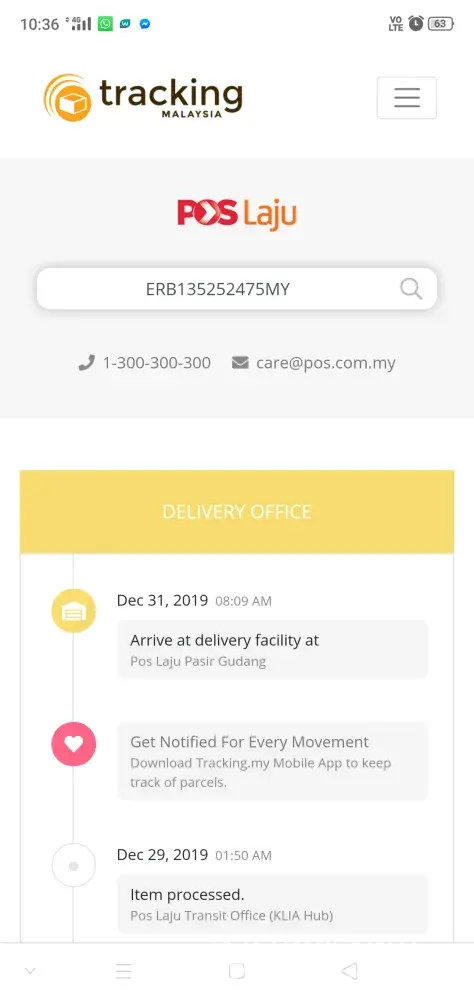 Service pos laju trlalu slow. Cek tracking no ERB084760343MY bgtau Barang sy still stuck kt pejabat pos taman industrial puchung lebih