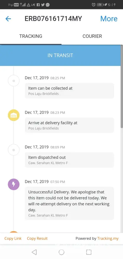 12.2019 status still dispatch out from batu pahat . Tracking no ERB084525402MY. PLEASE CHECK MY ITEM! ALMOST 10 DAYS DISPATCH OUT AND NO MOVEMENT. I WANT REFUND IF MY ITEMNOT RECEIVED! I CALL POSLAJU BATU PAHAT SOANY TIMES NOT ANSWER! BAD SERVICE! PLEASE SETTLED IT. I WANT MY ITEM