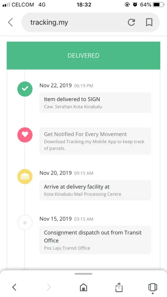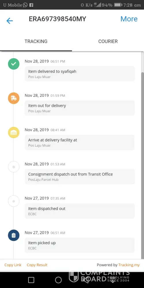 Barang belum sampai/diterima sampai sekarang. Tiada update tracking, last update 10 November 2019. Barang telah dihantar pada 05 November 2019 dan ianya telah melebihi dari tempoh yang dijangkakan (14 hari). Sudah bermacam laporan dibuat dan sampai sekarang belum mendapat apa-apa makluman mengenai barang tersebut dari pihak poslaju. Di harap pihak poslaju dapat menyelesaikan masalah ini secepat mungkin.
