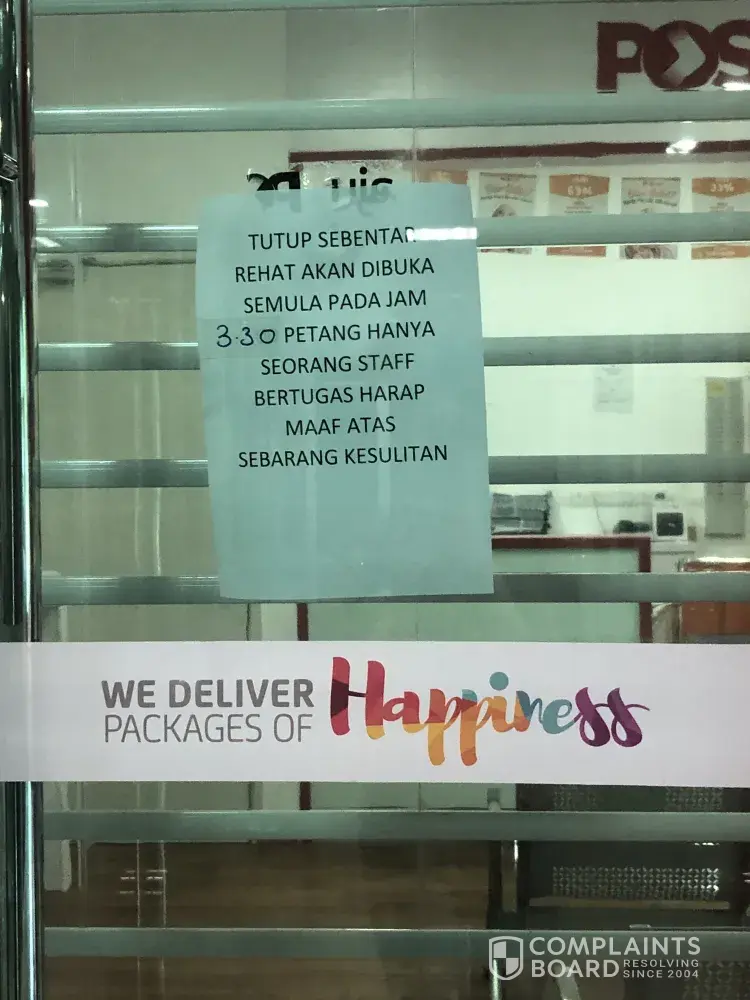 Saya nak buat complain pasal poslaju dalam universiti utara malaysia, sintok.. waktu bekerja should be buka 930pg.. tapi selalu pergi 9.30 pun belum buka lagi.. dekat 10 baru buka.. and harini tarikh 3/12 saya pergi pejabat pos laju pukul 2.00ptg.. tengok dia letak notis cakap tengah rehat akan dibuka pada pukul 3.30ptg.. sebab staf yang bekerja hanya seorang.. tak akan la rehat dari 1-3.30 sebab staff hanya seorang sedangkan waktu rehat dh memang tetap pukul 1.00-2.00ptg..