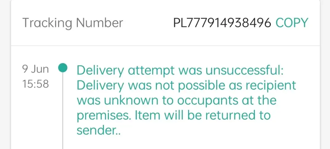 9 Jun 2022 : Delivery was not successful because I'm not at home and they will send back my parcel to sender.