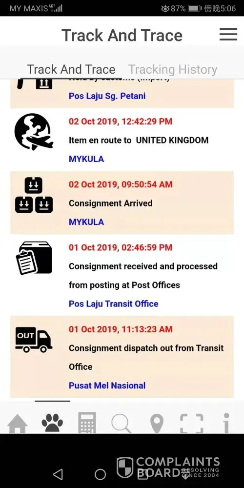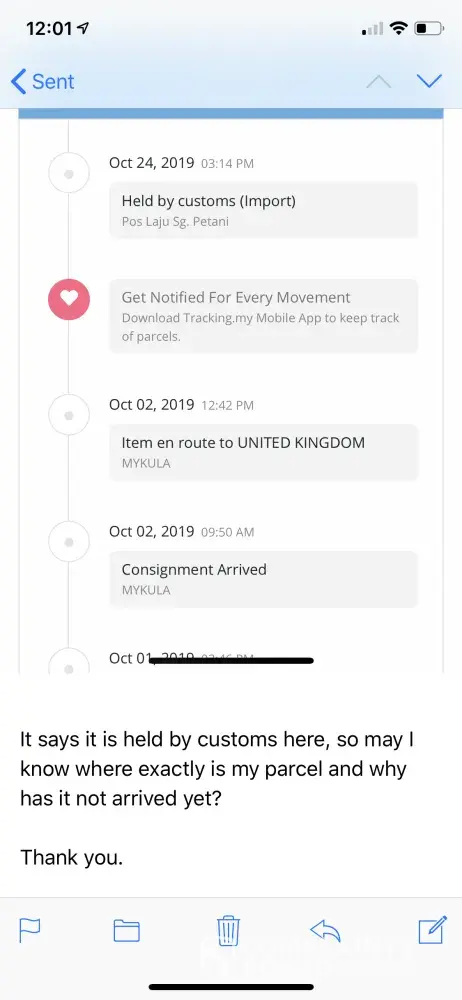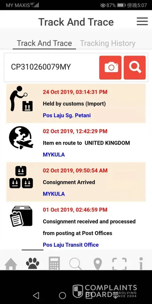 Hi, my family sent me a parcel from Sungai Petani, Kedah on 29 Sept 2019 and should arrive by now in the UK. According to track and trace, my parcel is held at customs, but when my family called HQ about it, they said the parcel has arrived in the UK and that we should contact Parcel Force UK not them, as they would not ‘tanggung' (hold responsible) for it anymore. But as I called and emailed Parcel Force, they said they have not received the parcel as it is not scanned into the system, so the parcel is still with Malaysian force. I emailed care@pos.com.my, but still no respond till today! Please do contact this number [protected] and please can you advise where is my parcel? This is my tracking number: CP310260079MY. Thank you.
