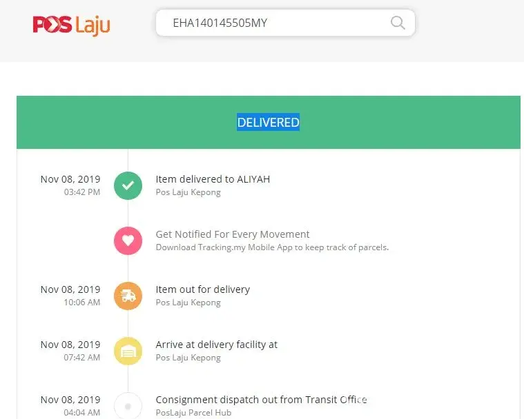 I would like to complaint regarding undelivered parcel to my place but in your system status showed as delivered. FYI, there is no such name at my place. Nobody has receive it so far.I've attached the consignment number & also screen shot of pos laju delivery status for your further investigation.