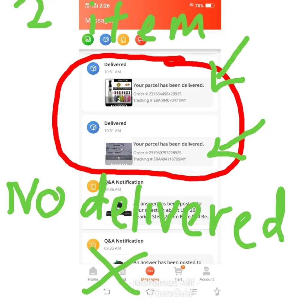 Di atas ialah msg yang saya terima di handphone serta di notis pembelian saya didalam talian. Mereka mengatakan yang parcel tersebut telah dihantar ke rumah saya dan mendapati saya tiada di rumah. Sedangkan pada tarikh dan hari tersebut dari pagi sehingga ke malam saya tiada kemena-mana dan hanya dirumah sahaja. Notis mengatakan parcel saya telah sampai dan saya tiada di rumah dan harus di ambil di pejabat pos pun tiada mereka tampalkan atau tinggalkan didalam peti surat rumah saya. saya sungguh kecewa dengan perkhimatan yang di berikan. saya berharap pos laju dapat mengambil tindakan kepada penghantar tersebut bagi menjamin perkhimatan pos laju di masa akan datang.