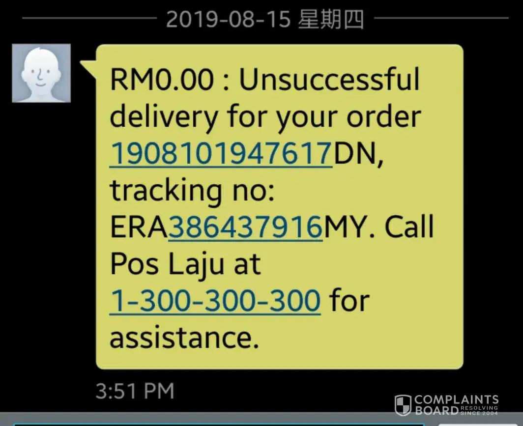 I have received a message of unsuccessful delivery for my order on yesterday [ 15 August 2019], trading no: ERA [protected] MY.