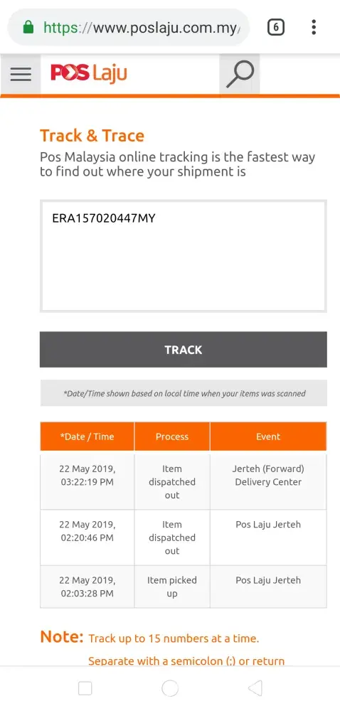 Salam saya nurul amalina. Sy mohon rungutan berkaitan dengan parcel saya . Tracking no. :ERA119017629MY. Mengikut rekod barang saya sepatutnya sudah sampai ke rumah pada 30/5/2019 bersamaan hari khamis jam 4 ptg dah diterima atas nama saya nurul amalina ic no [protected]. Tetapi untuk pengetahuan pihak pos laju saya langsung tidak menerima sebarang parcel saya..pintu rumah jgk tidak diketuk n tiada sebarang msg mengatakan barang sudah hantar. Kenapa dalam rekod sy dah terima barang. Terlalu byk isu dari pos laju. Mohon ambik tindakan dari pos laju. Jangan senang2 aniaya kami. Sukati ckp barang dah smpai senangkan barang langsung tidak di hantar. Untuk pengetahun pos laju semalam 31/5/2019 hari jumaat ptg sy sudah pun telefon pos laju berkaitan isu ini tp tiada sebarang tindakan..mohon sangat2 pihak laju ambik tindakan segera. Di sini saya sertakan brg yg sepatutnya sy terima. Terima kasih.