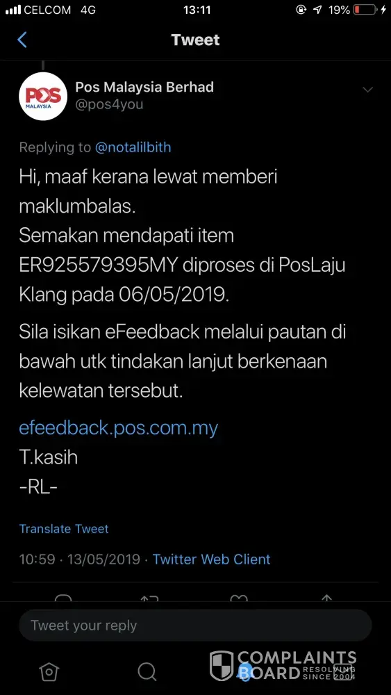 The item should be collected between 19/4 - 13/5 but the collection notice received on 13/5 late afternoon. It does not matching with the time frame that written on the collection notice. I went to pos laju to collect the said item but rejected by the staff, I explained to him and he told me to make a complaint to the posman.