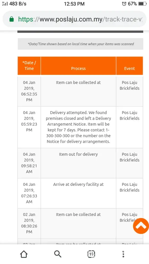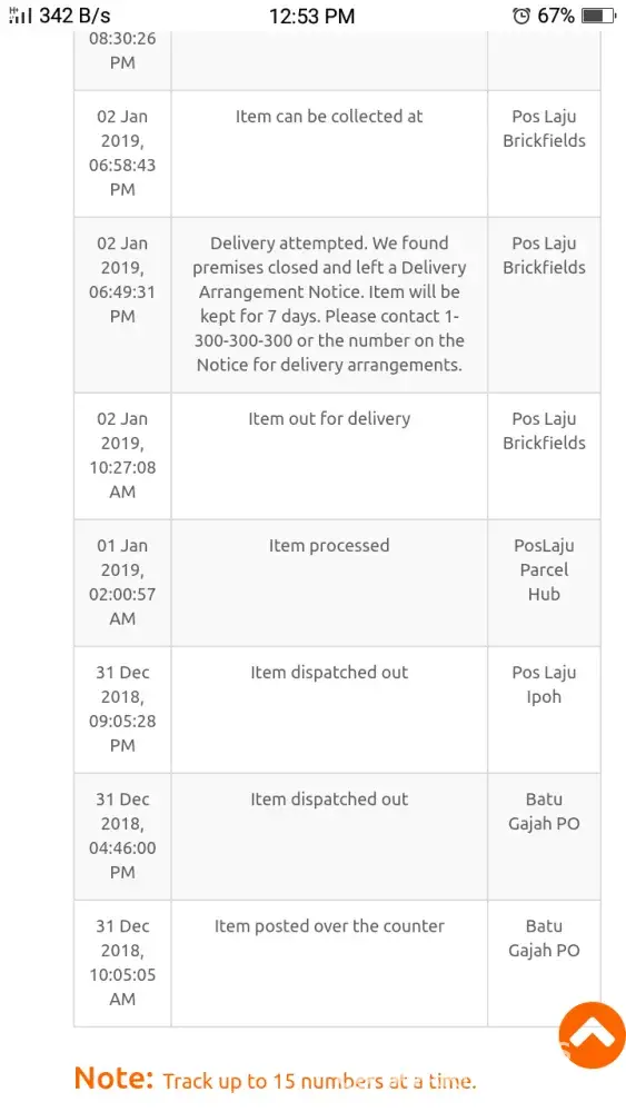 Based on the track n trace, item has arrived at poslaju balakong on 17/12/2018 from penang. Unfortunately after 6 days keep the item, poslaju balakong has updated in the system delivery failed on 22/12 and simply drop the notice sheet in my post box. Actually, i am at home during that time and furthermore no door bell ringing and phone calls made to me. Very frustated.