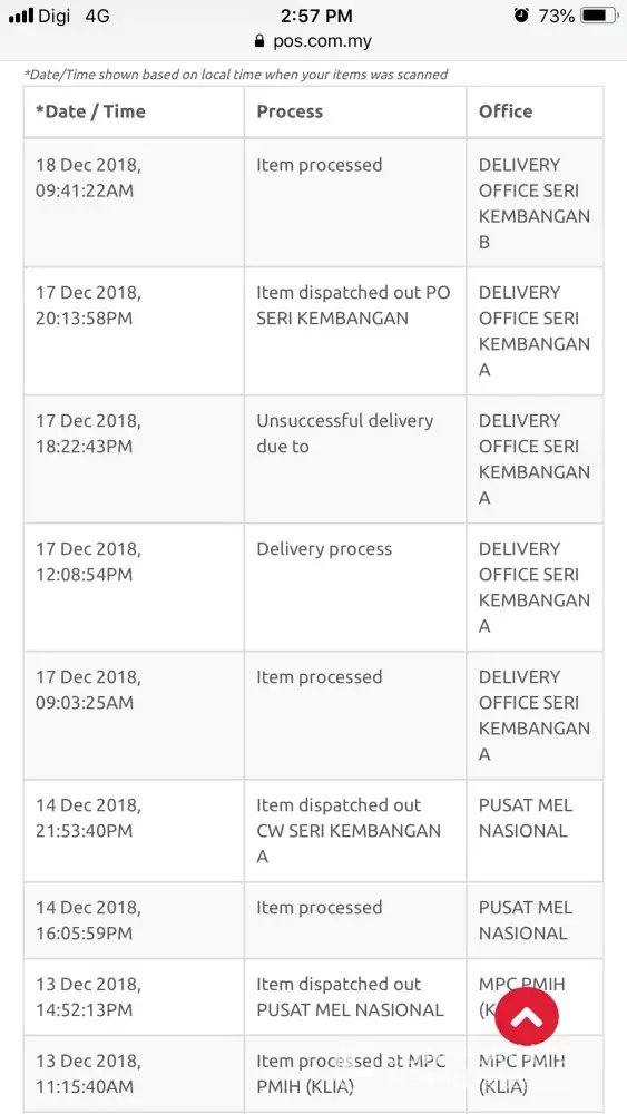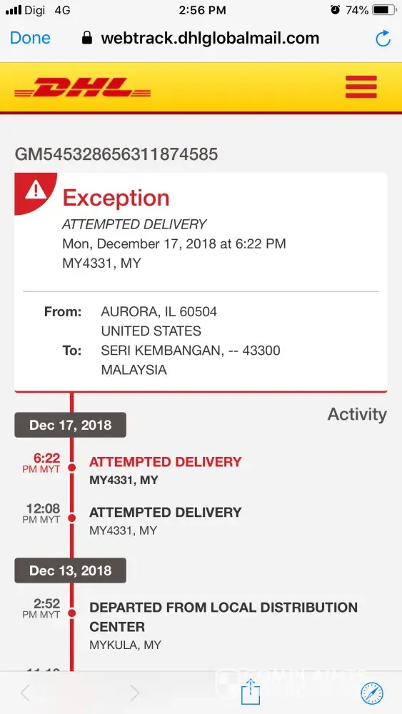 According to both DHL & Pos Msia website, attempts to deliver parcel to the office were unsuccessful on 17/12/18. See screenshots attached. No slip was given to collect the parcel.