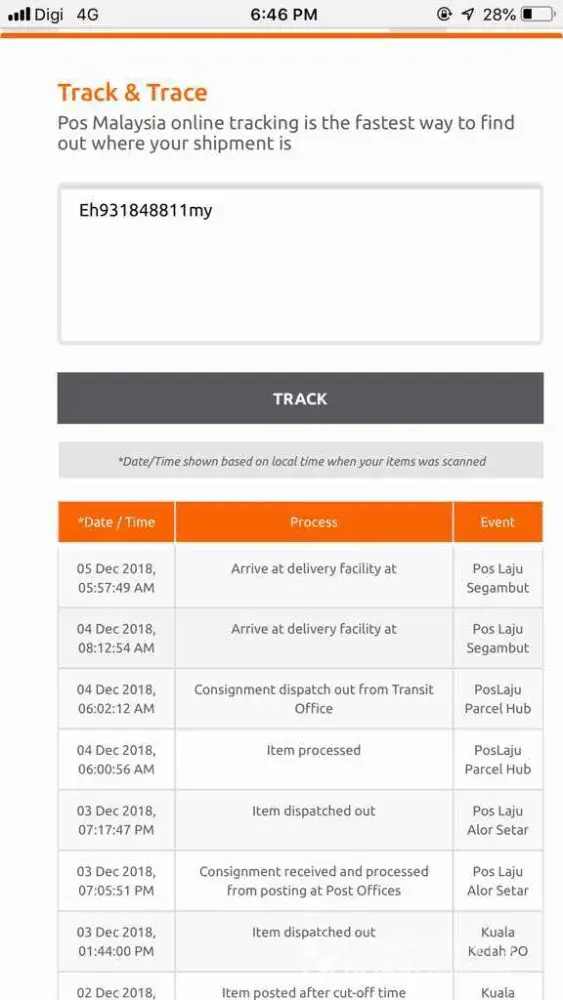I also have another courier from another source has arrived to Poslaju Jitra on saturday 24 Nov 2018 and I went there in order to receive it, the postman there has checked my coureir and it was arrived at there location already on that day but he refused to give it to me because he said; it must be scanned first, and he informed me to wait until next day (Sunday 25 Nov 2018) and it will be delivered to me, but it did not delivered to me as his information.