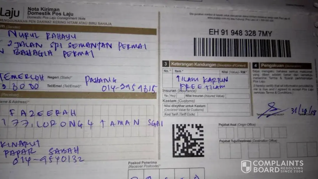 Pada tarikh 31/10/2018 barang saya telah dihantar melalui pos laju domestik yang bernombor eh919483287my daripada pahang ke sabah. Sampai ke hari ini 22/11/2018 saya tidak menerima barang tersebut malahan tiada rekod dalam sistem pos laju domestik. Mohon pencerahan apa masalah sehingga saya tidak boleh menjejaki di mana keberadaan barang saya tersebut. Barang itu adalah tilam. Tiada istilah rosak mahupun koyak sehinggakan ditahan dimana-mana cawangan pos laju. Sila berikan saya maklum balas berkenaan barang tersebut. Boleh hubungi saya ditalian [protected]. Terima kasih.
