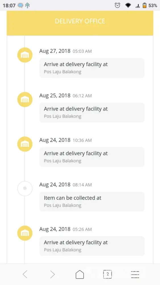 Brg yg saya order 6 days ago still xsmpai2.. Sejak dua menjak ni trdgr laa jugak yg servis pos laju ni dh xmcm dulu dah, brg lmbt smpai laa and ada yg xhntr trus & xtau kemana entah parcel tu, xsalahkn peniaga online sbb diaorg dh jlnkn tugas diaorg tpi yg hntr brg pulak masalah, aduiii.. Rugi laaa peniaga online cmni klau kena gnti brg/refund duit customer pdhal bukan salah diaorg punn