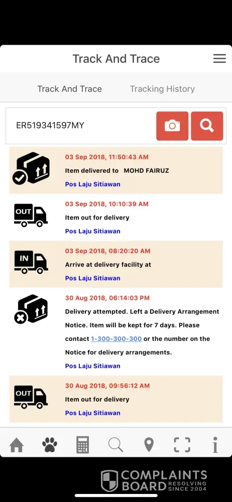 according to your tracking system (ER519341597MY), the delivery not success for the 1st attempted 30 Aug 18. this is okey to me, because already late then nobody stay at office. but in the system have mention that left delivery arrangement notice which is i didn't seen till today. then you make 2nd delivery on 3 Sep 18, which is i didn't request for that, because i plan to collect by myself at your branch. I'm very disappointing because the parcel was deliver to unknown name MOHD FAIRUZ, which is there is no staff's name FAIRUZ here. Finally, i still didn't know where to find my parcel! why not your staff call me if any third party was collect the parcel on behalf of me.
