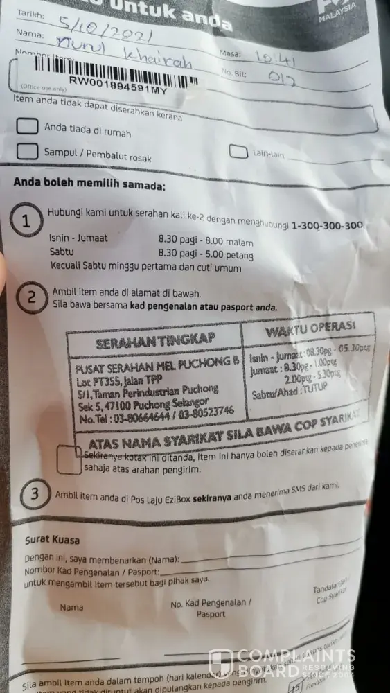 My parcel was posted on 9 sept supposed to be delivered to ezibox locker poslaju skudai but I was asked to collect from the post office but then by the time I finish my work the post office will be closed can't expect me to take leave just to collect my parcel. (ep831275421my)