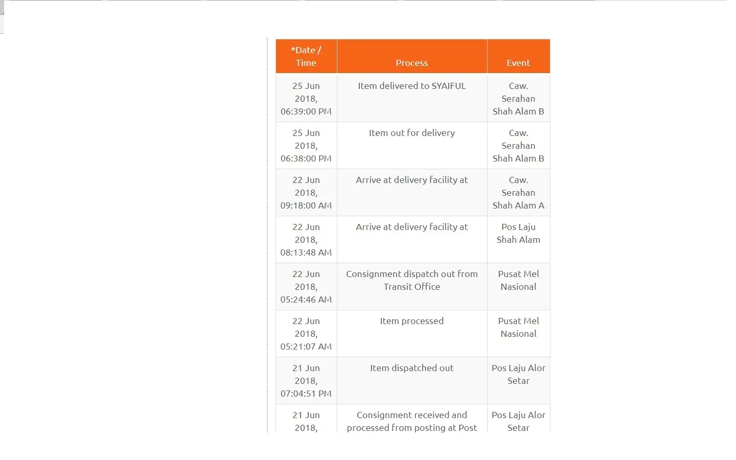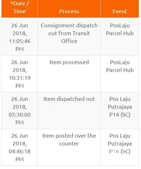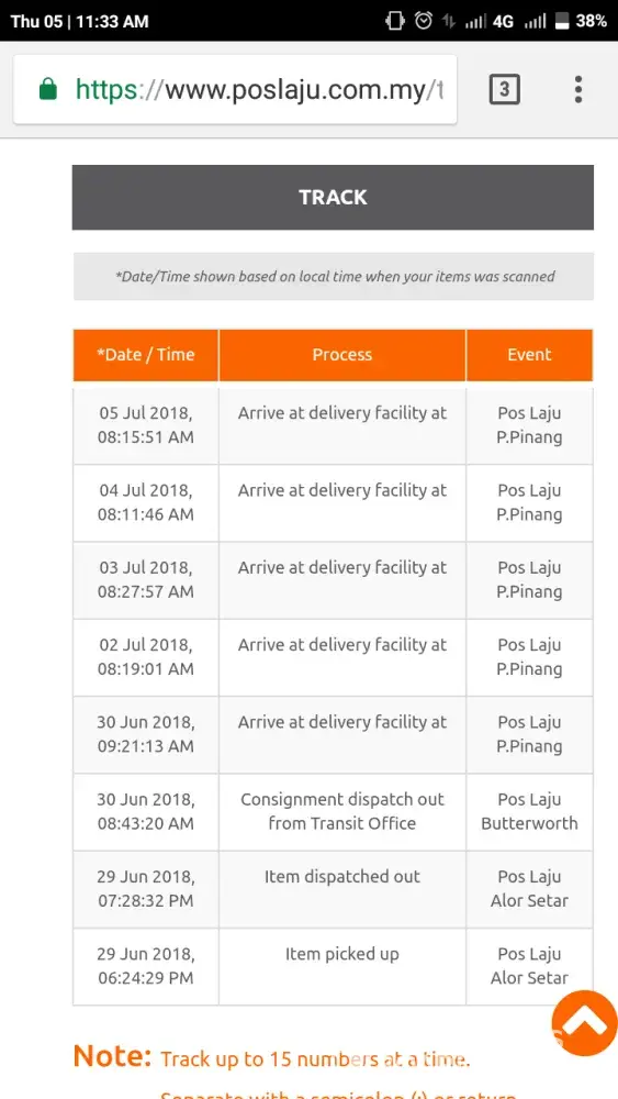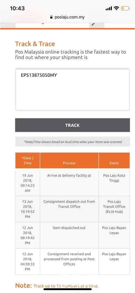 Tracking online status stucked at "arrive at facility Pos Laju Batu Caves".