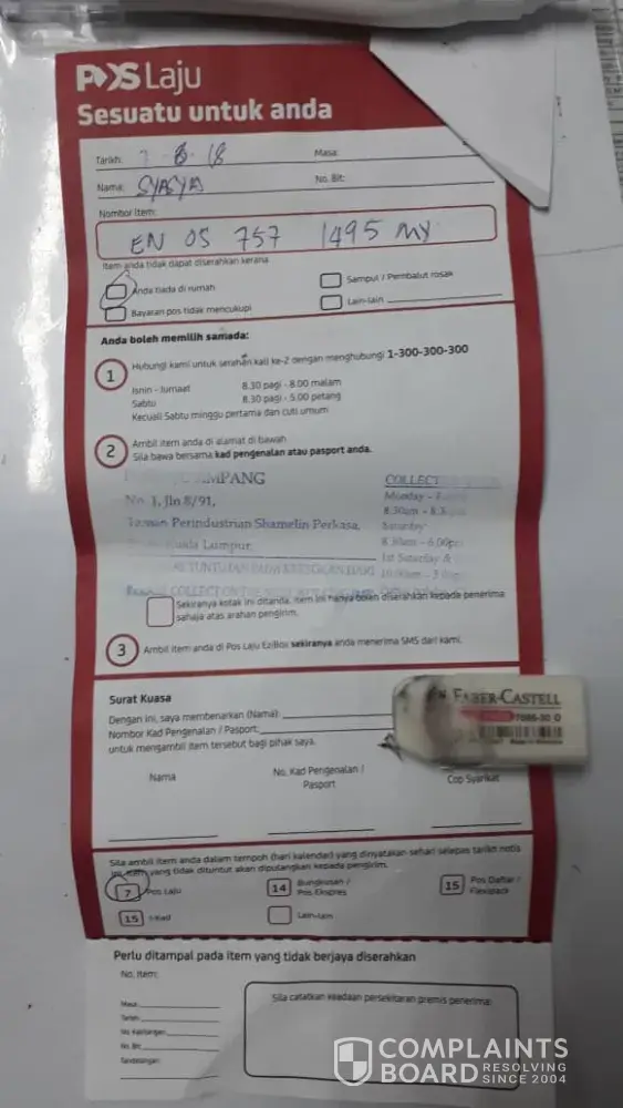 saya masih lagi tidak menerima barang saya. Di sini saya telah mendapat slip "poslaju sesuatu untuk anda" di dalam peti surat saya bertarikh 07.06.2018.