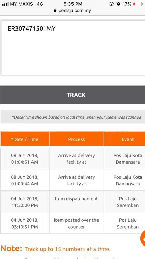 sehingga sekarang dalam status tracking barang saya masih di pejabat poslaju ampang.
