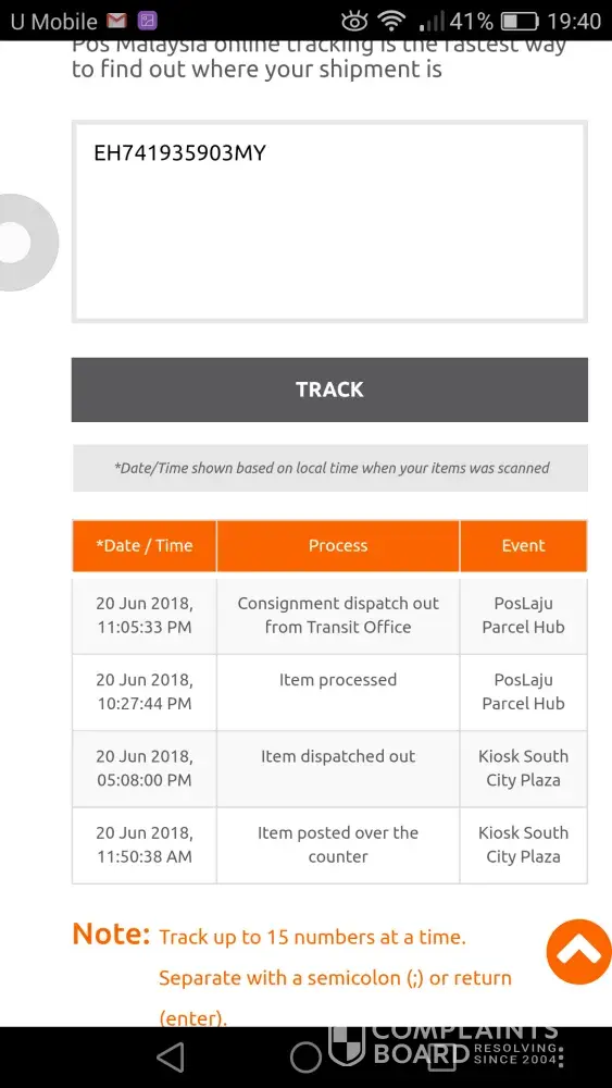 Tarikh pengeposan adalah pada 08 Jun 2018, 10:14:42 AM, sekarang dah 20 Jun 2018 tapi barang customer masih juga belum sampai. Bila trace barang masih "IN TRANSIT" dari 8 Jun 2018 sampai sekarang. Tracking Number : CD338139183MY Jun 07, 2018 10:14:42 AM Consignment dispatch out from Transit Office PosLaju...