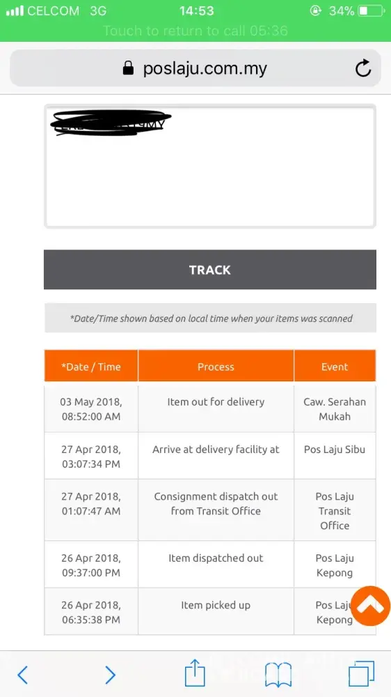 28/4/18 dah sampai pos laju bandar dato onn jb..sampai sekarang 6/5/18 check tracking still sama lagi.. Apa masalah pos laju sekarang ni sebenarnya ya..? Agak2 lah..jgn buat pelanggan tertunggu2 .ataupun nak tukar nama jadi pos lambat pulak.? Tolong ye perbaiki mutu perkhidmatan anda wahai pos laju..please double check dan hantar brg saya secepat mungkin.