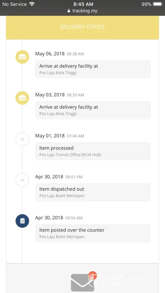 Saya tidak menerima surat berdaftar dpd SKMM walaupun posmen menyatakan yang dia telah buat serahan pada 02 April 2018. Malah, apabila saya rujuk penyata serahan, nama, no. kad pengenalan dan tanda tangan BUKAN nama, tanda tangan dan no. kad pengenalan milik saya. Saya juga telah bertanya kepada jiran-jiran saya jika mereka ada mengambil surat tersebut tetapi memang TIADA. Saya juga dengan telah buat aduan kepada SKMM kerana surat tersebut mengandungi lesen radio amatur saya. Pihak SKMM minta saya buat aduan semula kepada pihak Pos Malaysia untuk menyiasat ke mana surat saya tersebut dan diharapkan ada tindakan daripada pihak Pos Malaysia kerana ini adalah amanah.