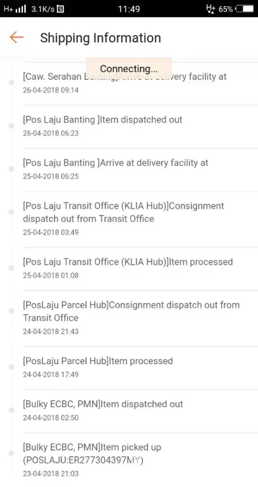 Barang sya pos pada 3/5/2018. 4/5 sampai sekarang 8/5 barang tu still tersangkut dekat Poslaju Parcel Hub. Come on lah pos laju, sya nak guna urgent barang tu. Sepatutnya bukan dalam masa 3-5 hari dah sampai ke. Barang tu di pos di KL, sya duduk di Johor. Kalau nak diikutkan tak jauh pun. Geram betul dengan pos laju ni. Tracking no sya : EH811262826MY.