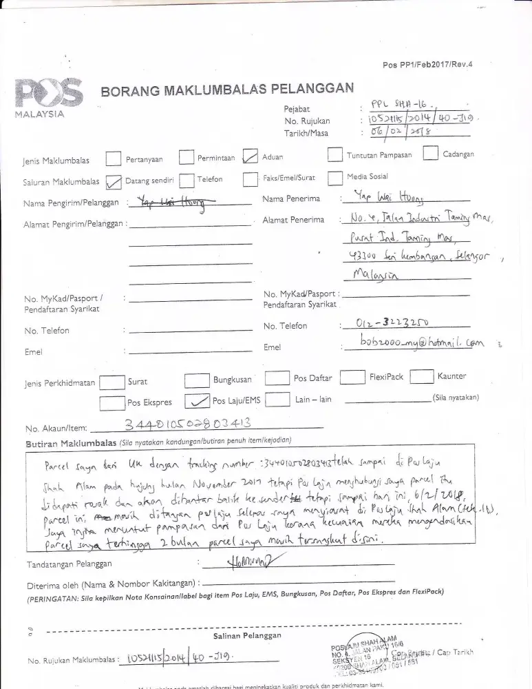Our parcel from UK with tracking number: [protected] that reached Poslaju on the 30/11/2017, was apparently damaged and will be returned to the sender as it is the standard operating procedure. We requested to have a look at the parcel with of one the officer who called us to inform of the damaged parcel but the request is declined as they said it is already being wrapped and need to be returned to sender. So for the past 2 months we have been checking with the sender from UK whether the damaged parcel is return to them and the answer is negative all the while. We think it is ridiculous for the damaged parcel to reach them and therefore we decide to check with poslaju and as everyone knows, calling them is useless and sucks as no one will pick up the phone so we drove up to Poslaju Shah Alam which ask us to check with another Poslaju Shah Alam(Sek.16) and finally after checking by one of the officer, they informed us the parcel still with them. After querying them for the reason the parcel still with them and the answer we get is due to their human error and the parcel get send to the wrong department and left to rot if we did not check with them. Here, I would like to demand a compensation from Poslaju for the value of our parcel due to the loss and inconvenience that happen to us.