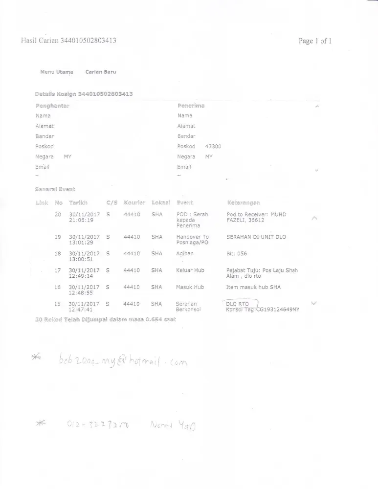 call [protected] also no answer. waste time and phone credit only! no responsible courier! at least call customer and notice about what happen, but didnt happen because pos laju dont do their job as a job!