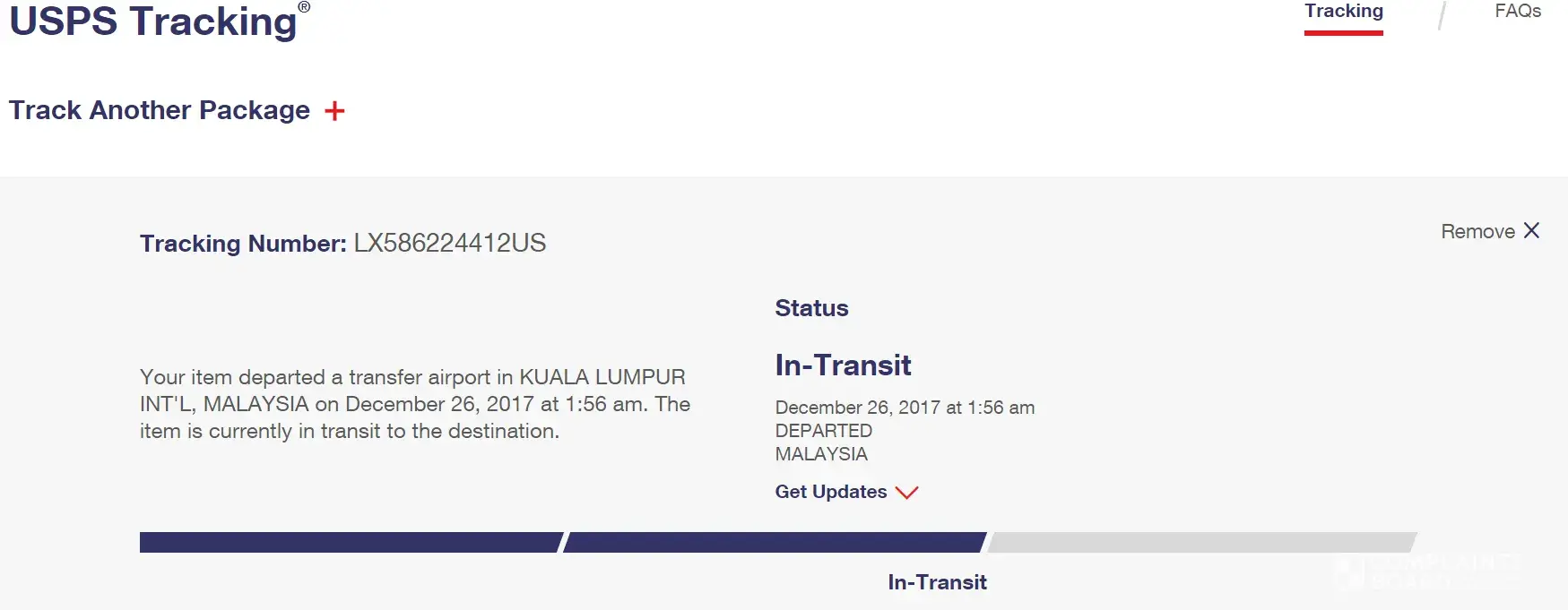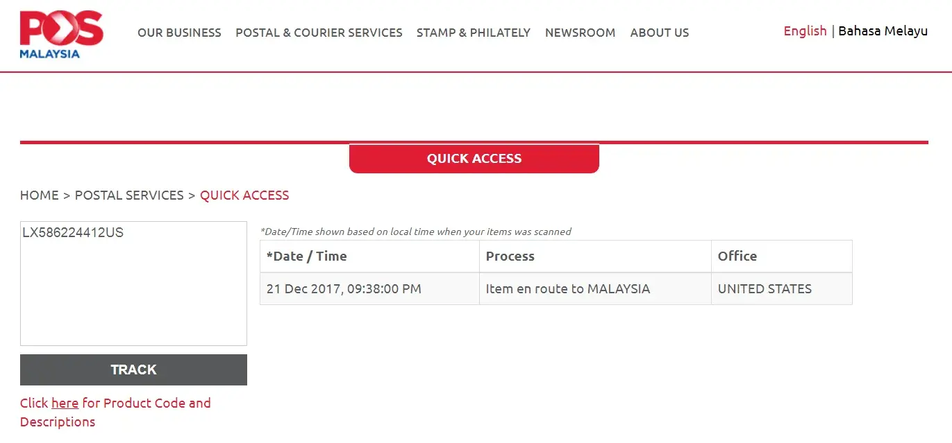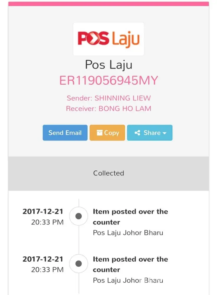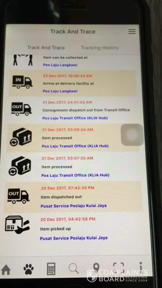 The item first dispatched out on 21 December 2017 from Consignment dispatch out from transit office at Pos Laju Johor Bahru.