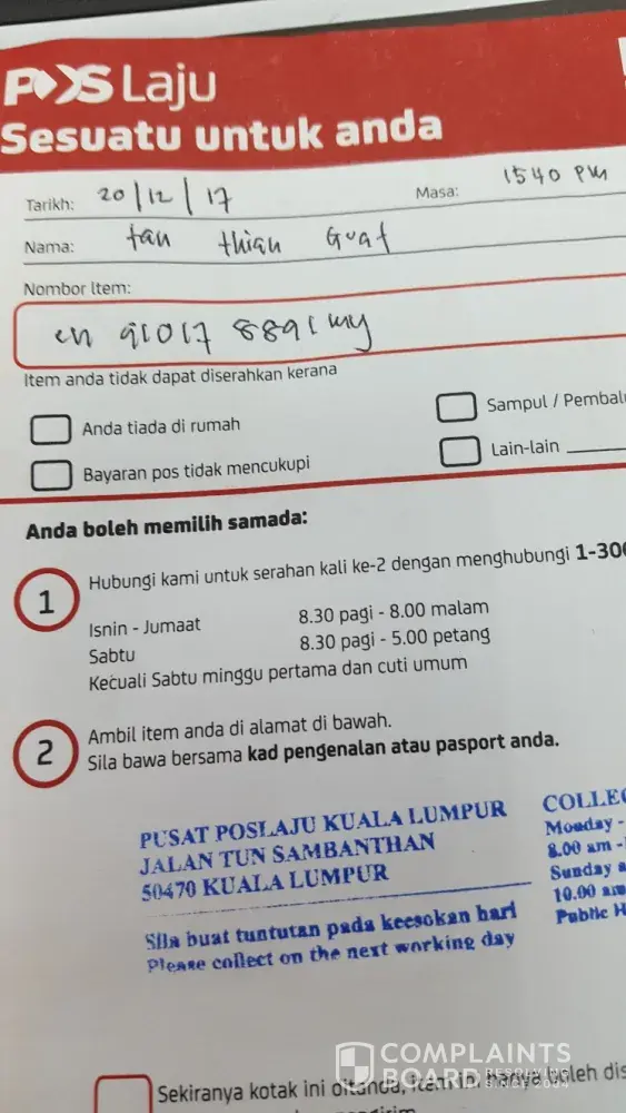I try to track my parcel for a few days to know that i have to collect my parcel by myself? So why i have to pay? Do you gonna pay my fuel consumption to go there? (nilai) On 20/12 the item posted over the counter. Yesterday, 22/12 item out for delivery from POS LAJU NILAI and at 3.44pm it cannot be delivered without telling any reason. THE WORST PART. I try to call POS LAJU NILAI since yesterday and they don't ever bother to pick up the phone? I try to call few number for example POS GIANT NILAI. I just need to make a single call for them to pick up the phone. Thanks for their responsiveness. So what happened to the worker at POS LAJU NILAI. Dead already ah?