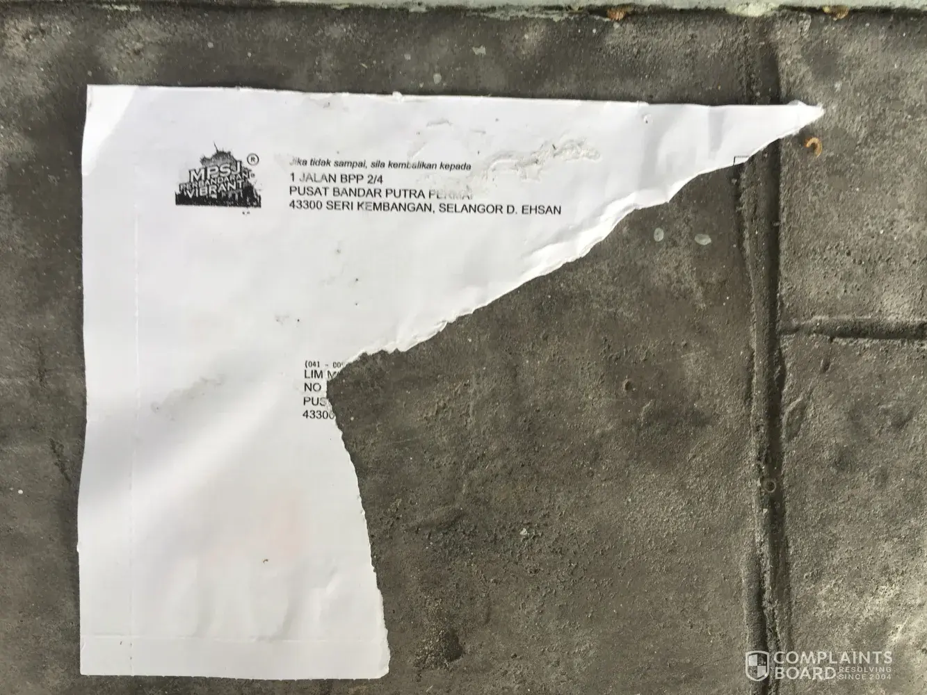 I parked my car in front of my house, not entirely blocking the letter box but it still can be reach if the postman is willing to get down from his motorcycle. The Post man leave a confidential letter by MPSJ on my car's front mirror wiper. I didn't realise and drive in the rain and the letter was wet and Mesh, blocking my sight and dangering my drive. I had to stop a side to clean it. Below picture is what's left and we can't figure what's the content of it. I would like to file a complaint towards this postman on his bad working attitude.