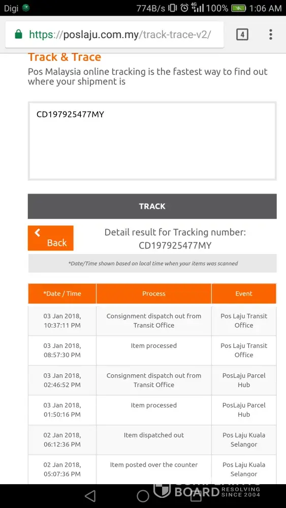 Tracking system showed no updates since 3Jan18, poslaju office never pick up my calls, [protected] forever busy no answering my call as well. Quite frustrating spending minutes to listen to advertisements in line. I don't even know if my parcel arrive at Miri or still stuck somewhere else universe. Please take action or at least update its status in your system, thanks!