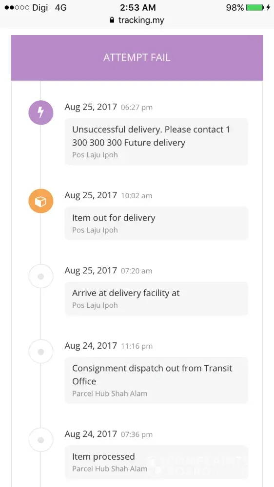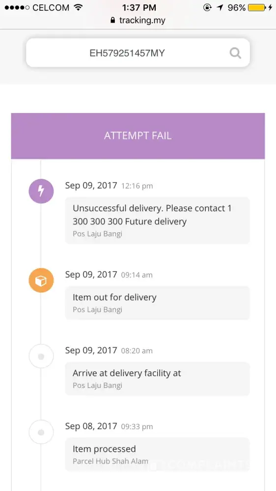EM796067345MY This is my tracking no i was at home the whole day waiting fir my parcel but they didn't deliver instead when i check the poslaaju tracking it shows unsuccessful delivery and collecting at poslaju. This is the 2 nd time happening to me. Im paying to gt delivered to doorstep but this is really very disappointing . Each time i call the hotline no one answers and my money is been deducted. Wasting mu money time energy to collect the goods. Worst service. Hope you will look into this matter seriously. I think im not the first one.