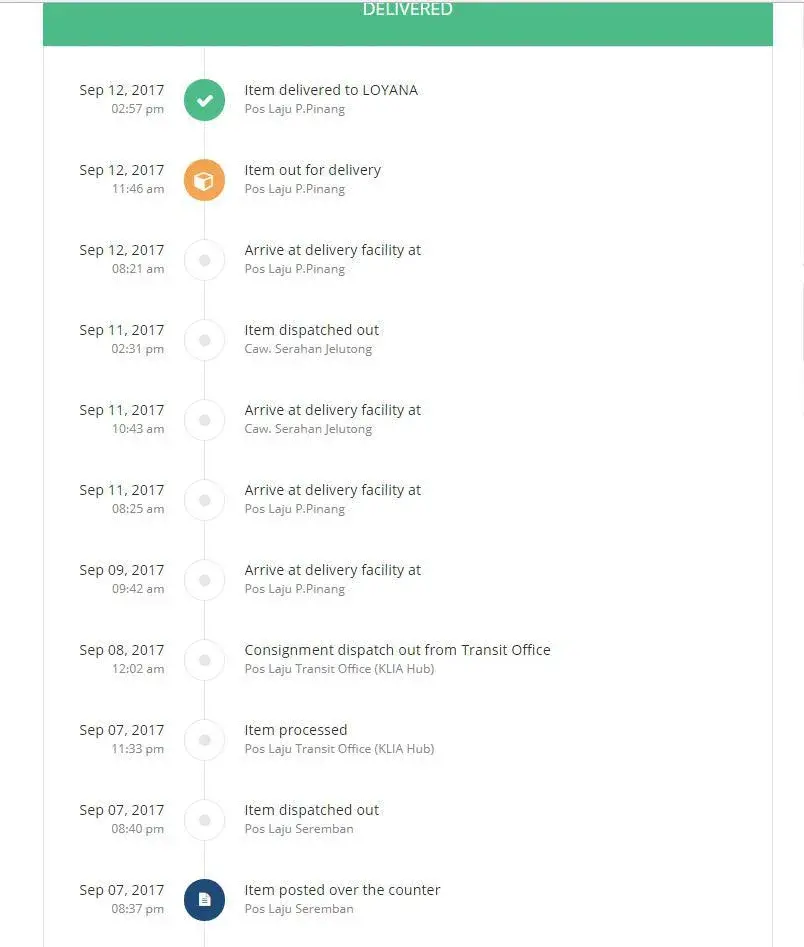 Parcel sepatutnya sampai(dispatched out) pada 11/9/2017 tetapi parcel tersebut terlewat sehari dan sampai kepada saya pada 12/9/2017. Saya telah menghubungi pihak pejabat pos serahan cawangan Jelutong, Pulau Pinang pada 11/9/2017 dan mereka memberitahu parcel tersebut telah diedarkan ke pejabat pos Jalan China st., Pulau Pinang dan sedia untuk dihantar tetapi parcel sampai pada 12/9/2017 . Namun, apa sangat mengecewakan parcel yang sampai dalam keadaan yang tidak baik (terkoyak) serta barang didalam parcel jugak turut terkoyak.