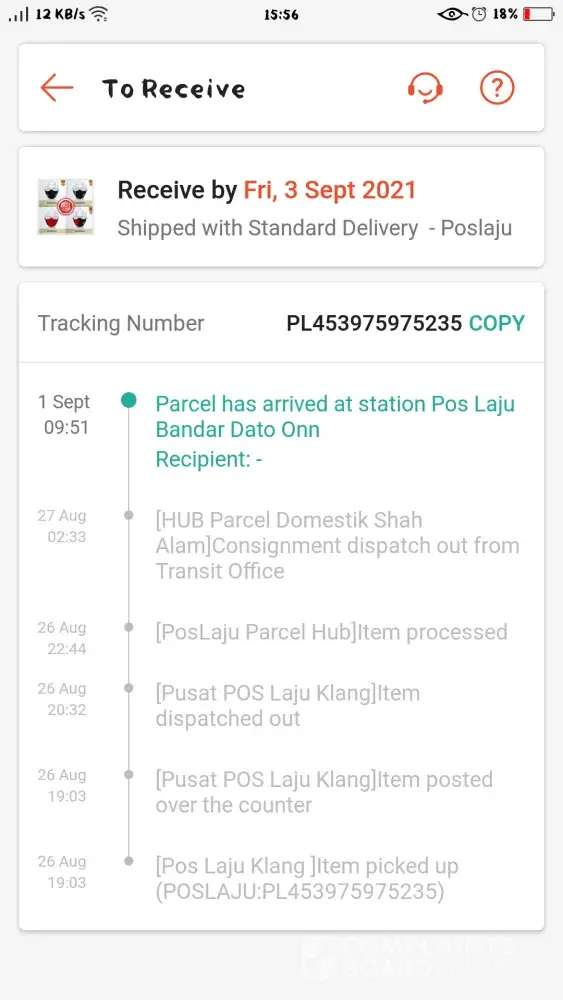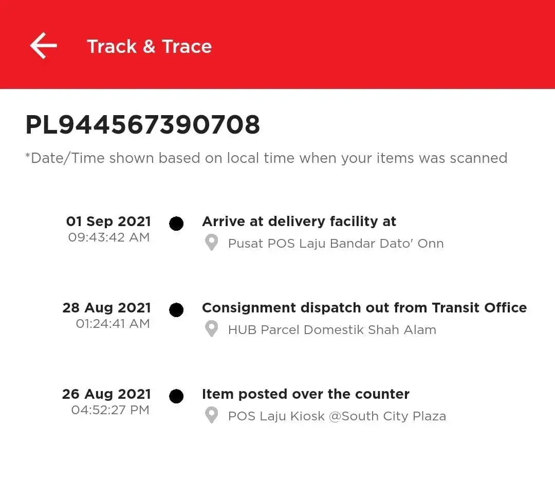 Parcel Pending at POSLAJU DATO ONN ( 1/Sept - 5/Sept)