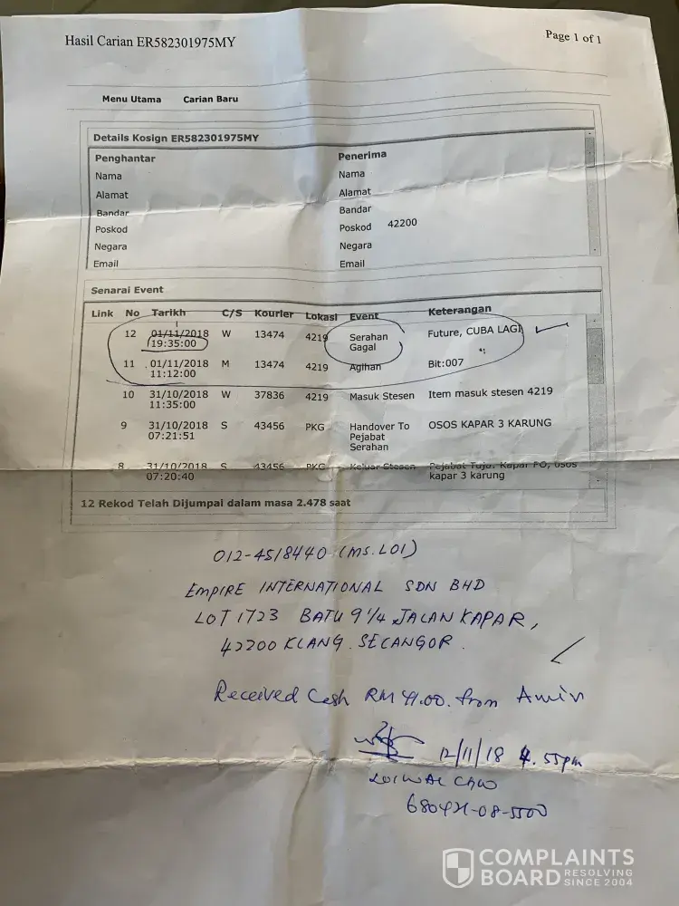 RM0.00 : Unsuccessful delivery for your order 1812021403723BA, tracking no: ER631670625MY. Call Pos Laju at [protected] for assistance.