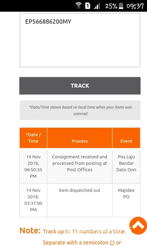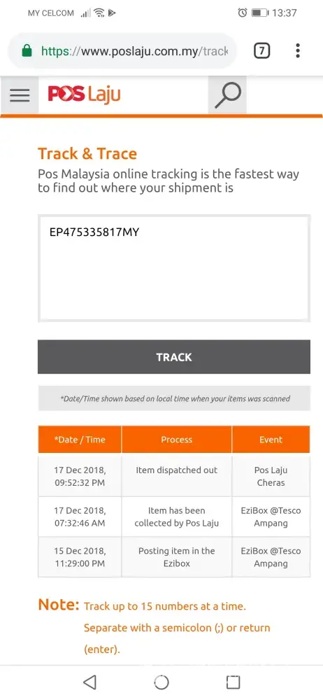 Apa la pos dato' on ni.. cakap barang dah delivery tp tak sampai pun, mana ada pos hantar barang kul 6.30 bukannya pos tutup kul 5.. mana barang saya pos bandar dato' on.. tolong di betulkan update tu