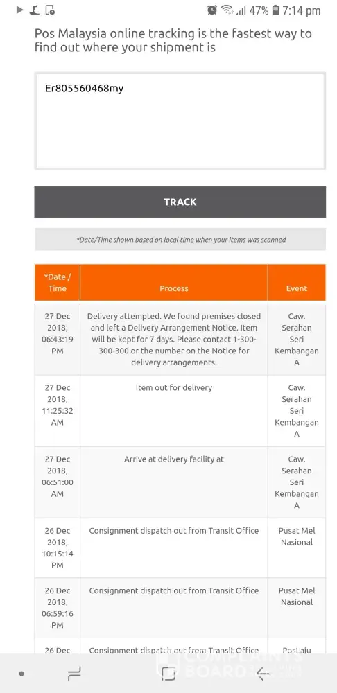 I've wait my item from 26th December. On 29th Dec you all updated the item is arriving poslaju Melaka. Today is 31st December but my item is not attempt to delivery. So i have to wait another 2 days because off New Year Holiday. Such a pity service with the increastment of fee.