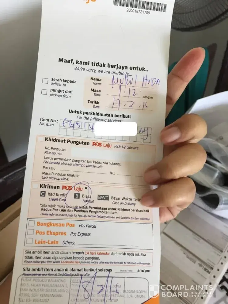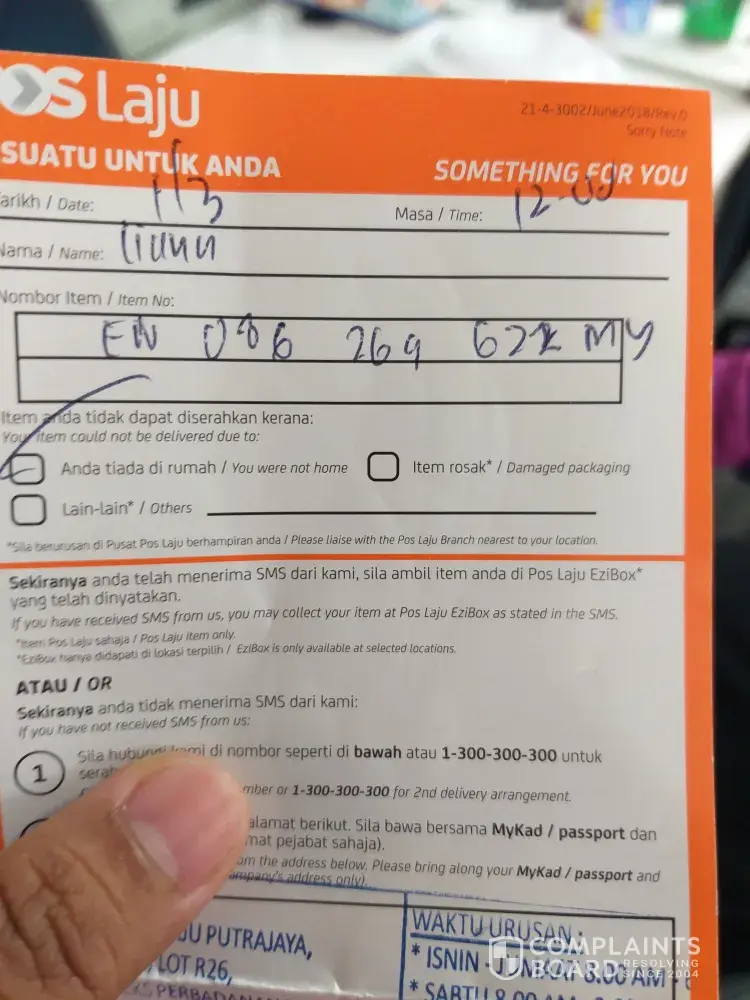Saya tunggu dirumah sepanjang hari...mcm mana posmen kata tiada org dirumah? Tiada notis, tiada call pun...kalau mcm ni senang la kerja...x perlu hantar just update suruh amik sendiri..harap pihak pos ambil tindakan..jangan makan gaji buta