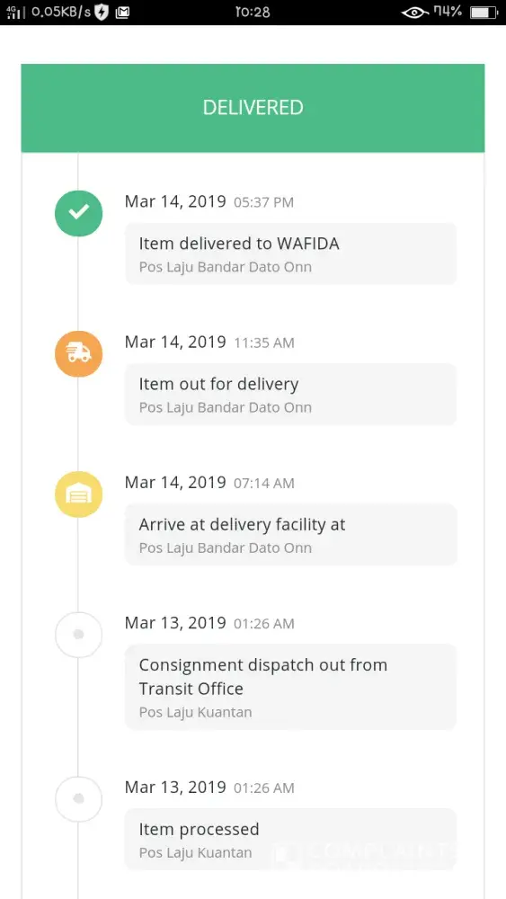 Hi, i want complaint .. my item not received on my hand.. but in tracking number already delivered.. & i don't how can be delivered because on that date, don't have any postman was do delivered.. so my item was lost.. help me! 😭