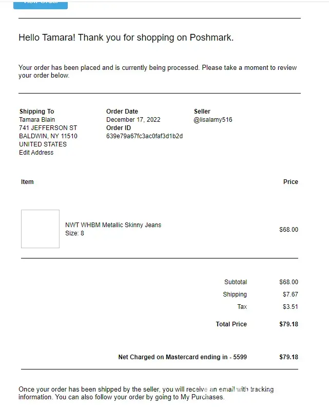 I purchased a pair of WHBM skinny jeans from seller @lisalamy516 that were new with tags – about $80 after tax. Upon arrival, I immediately tried them on and found a small defect – it was fraying near the zipper. The same day, I wrote the seller, described the defect, sent pics, and requested an exchange – she never responded.