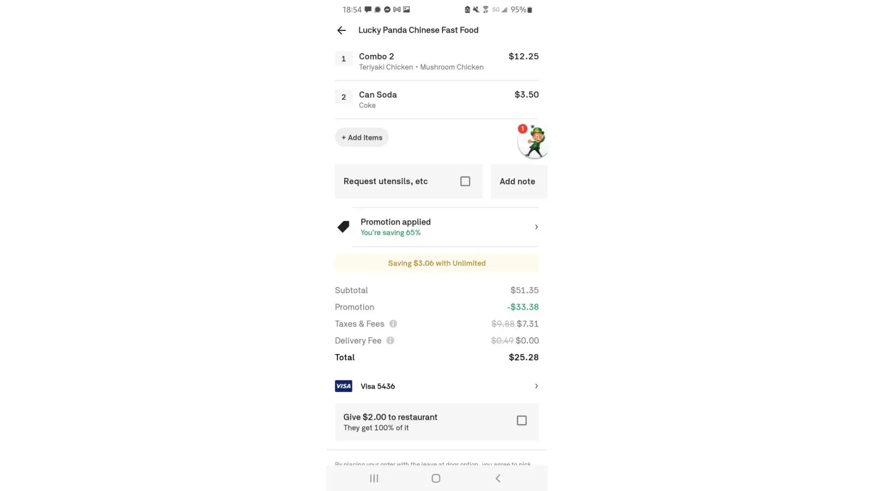 I received an email with an email with a promo up to 65% off. I clicked on it and per my postmates account, I did have the promo and it was applied to my order. Took a screenshot to send to a friend. Subtotal was $51.35, promotion took off $33.38, total was $25.28, not including tip which was $8. Overall charge should've been $33.28. However after I placed the order and saw my email and bank statement, I was charged $68.48. Even tho I changed the card the money would be pulled from, there's no excuse for it taking off the promo when it's applied to my account and not my card.